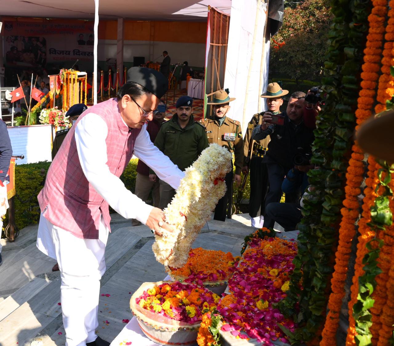 मुख्यमंत्री श्री पुष्कर सिंह धामी ने शुक्रवार को गांधी पार्क, देहरादून में विजय दिवस के अवसर पर शहीद स्मारक पर पुष्प चक्र अर्पित कर शहीदों को श्रद्धांजलि दी