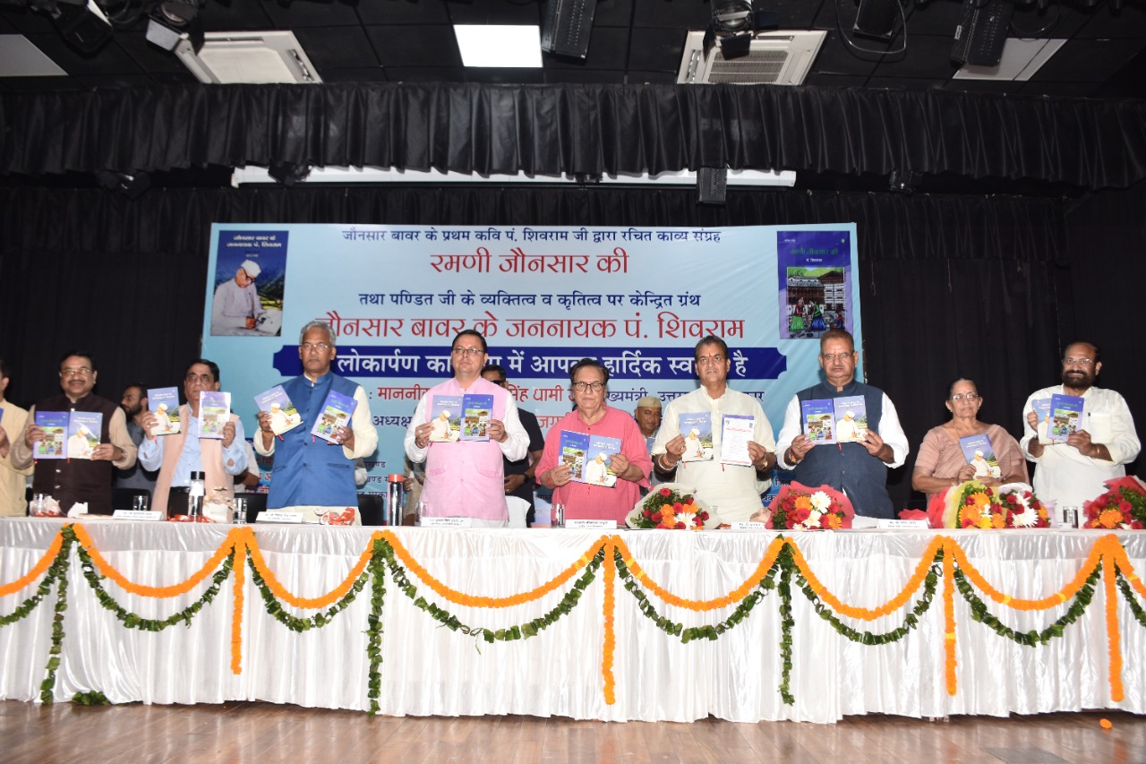 मुख्यमंत्री श्री पुष्कर सिंह धामी ने शुक्रवार को आई.आर.डी.टी सभागार, सर्वे चौक, देहरादून में जौनसार बाबर के प्रथम कवि पं. शिवराम जी द्वारा रचित काव्य संग्रह ’रमणी जौनसार ’ एवं पं. शिवराम शर्मा जी के व्यक्तित्व व कृतित्व पर केन्द्रित ग्रंथ ’जौनसार बावर के जननायक पं. शिवराम’ पुस्तक का विमोचन किया। मुख्यमंत्री ने कहा कि चकराता क्षेत्र में पंडित शिवराम शर्मा जी मूर्ति लगाये जाने के लिए प्रस्ताव आयेगा तो उस क्षेत्र में उनकी मूर्ति स्थापित की जायेगी। उनके द्वारा लिखी गई कविताओं का संग्रह कर संजोया जायेगा।